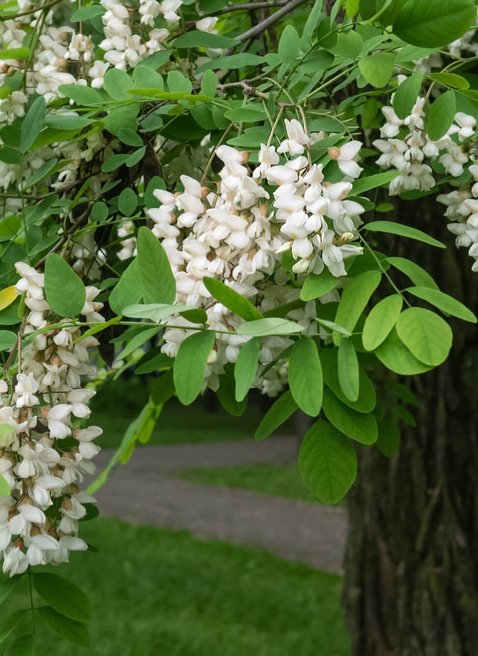 Ce bel arbre est originaire de Virginie et a été introduit en France en 1601. Ce premier exemplaire est toujours vivant au jardin des plantes à Paris. Aujourd’hui il est communément cultivé en France. Dans son développement il s’élève jusqu’à vingt cinq mètres de hauteur. Son tronc est bien droit avec des branches longues et grêles, armées de fortes épines latérales. Ses racines ont la particularité d’avoir des nodosités renfermant des bactéries fixatrices de l’azote atmosphérique. De plus, il rejette abondamment ce qui lui a valu d’être classé à tort comme plante invasive. Ses fleurs sont blanches, très agréablement odorantes et forment des grappes pendantes si nombreuses que l’arbre en devient presque entièrement blanc au moment de la floraison. Les abeilles aiment particulièrement cette fleur et le miel d’acacia est apprécié. Par contre le bois, l’écorce et les graines sont toxiques. Les fleurs sont comestibles en beignets.